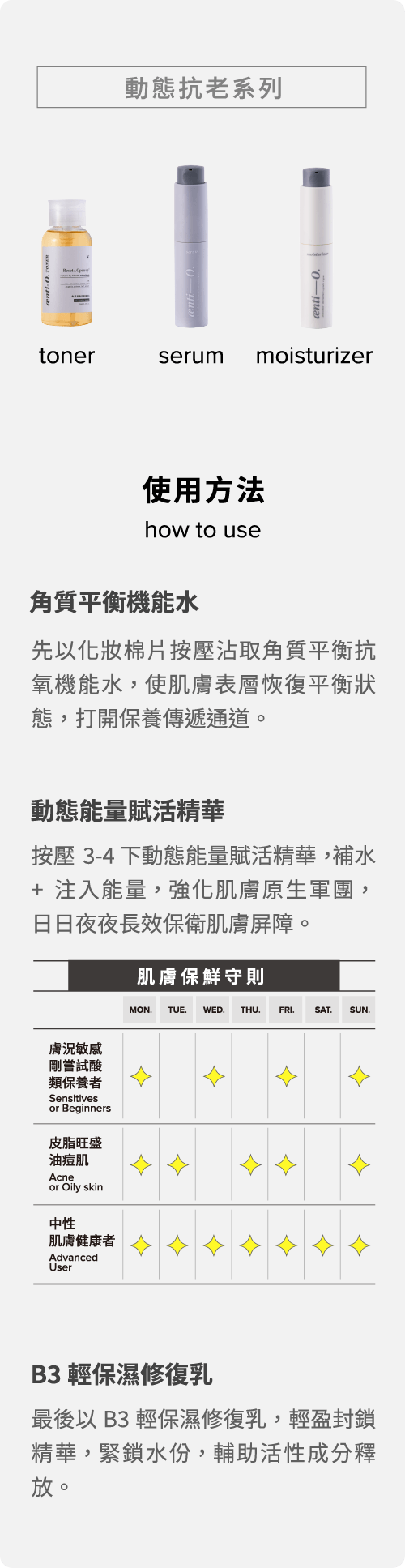 aenti-O. 認為透過強化屏障機能(antioxidants + skin barrier),加乘信號因子(growth signal)