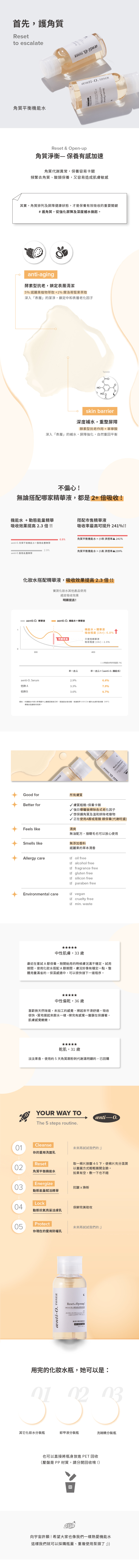 嚴選超抗老植物精萃鎖定中和肌膚表層老化因子,在肌膚內還原成水分,大量補水,重整角質平衡。保養,有感提升。